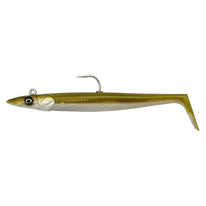 With a lively kicking action on both the drop and the retrieve, this super realistic sandeel imitation will fool even the wariest of predator fish. The unique jig head ensures a perfect rolling action and that the lure will come up on retrieve. The Pro Peg body holder makes it possible to peg the body to the head with a toothpick, creating a very simple and secure hold. The soft PVC body comes pre-rigged with an internal glass rattle that gives off a provoking sound to any nearby hunting fish. This weedless version of the lure features a strong click-on connection for the interchangeable EWG hook.